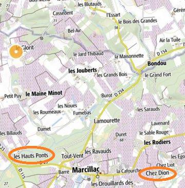 A noter qu’à Marcillac se trouve un lieu-dit « Chez Dion » qui s’appelait autrefois « chez Guion » mais pas de lien avec les ancêtres Dion de Céline qui sont eux originaires de l’Orne, il y a également un lieu-dit « Chez les Roux »