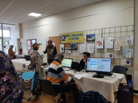 Le Cercle Généalogique Sud Saintonge a participé, ainsi que le cercle de La Rochelle, à la demande du Cercle Généalogique de Saintes, à cette journée de rencontre de généalogie. Le public est venu nombreux et très intéressé. Ils ont pu questionner les 3 cercles et voir de nombreuses généalogies exposées.