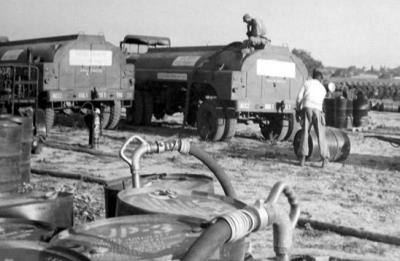 La création de l’aérodrome commence. Les Américains créent deux pistes en croix de 500 mètres en creusant un trou immense qui deviendra bien plus tard l’hippodrome de Grand’ Lande qui fermera en 2012.