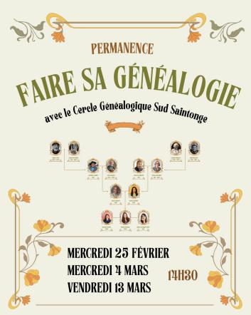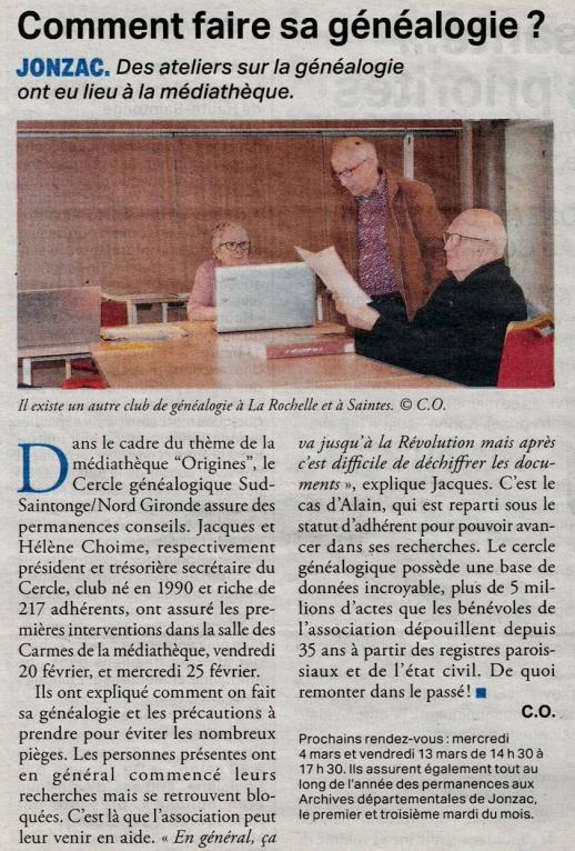En accord avec la Médiathèque de Jonzac des ateliers de généalogie ont été organisés par le Cercle généalogique Sud-Saintonge/Nord Gironde. Trois permanences ont eu lieu, les 25 février et les 4 et 13 mars. Les responsables ont montré comment commencer des recherches familiales et éviter les erreurs courantes. Comme indiqué dans l'article de la Haute-Saintonge l’association aide les personnes bloquées dans leurs recherches et possède une grande base de données de plus de 5 millions d’actes provenant de l’état civil, des registres paroissiaux permettant de remonter avant la Révolution. Des permanences et d’autres ateliers sont également proposés durant l’année.