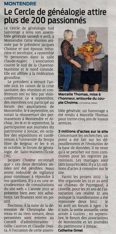 Après l'assemblée générale de 2021 qui avait été organisée par courriel, celle de 2022 a pu avoir lieu à Montendre à la salle Municipale.